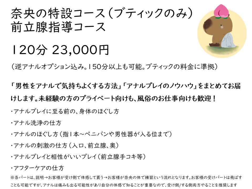 女性用風俗『ブティック』店長兼セラピスト、系列店『アーメン東京』在籍中。女風ユーザー向けの施術だけでなく、女風店舗向けの研修(講師)や現役セラピストへの座学・実践アドバイスなども垣根なく行う。「アナル四十八手」をリクエストできるレアキャラ。セラピストとしての活動は2023年3月までの予定。Twitterの動向をチェックすると女風界隈のことがいろいろ伝わってくる、かも。