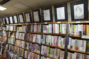 店内には、本棚の上に駕籠先生のモノクロ原画がズラッと並ぶ。
